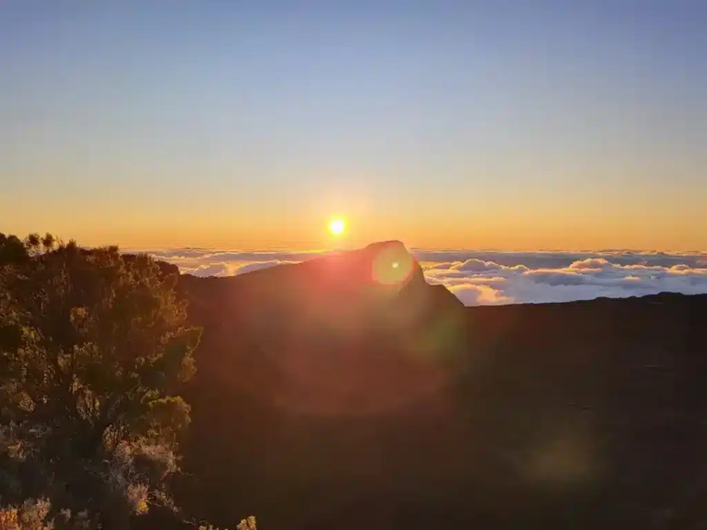 Heure de départ ajustée selon l’heure du lever du soleil (entre 3h30 et 4h30 du matin), pour arriver au Pas de Bellecombe à temps pour admirer les premières lueurs sur le cratère Dolomieu. Un moment magique et silencieux à ne pas manquer.